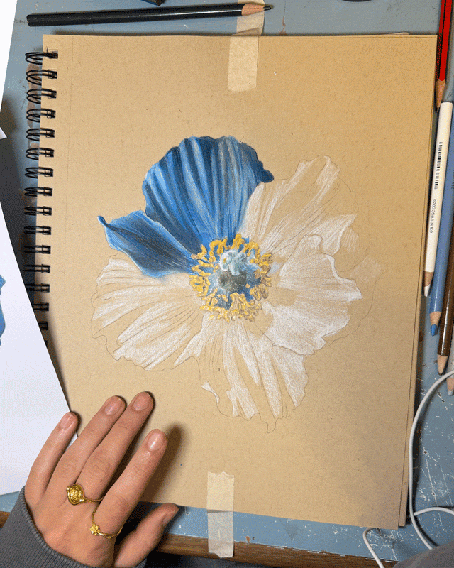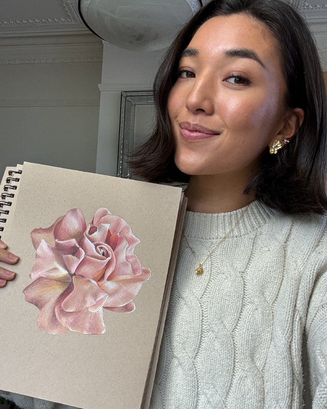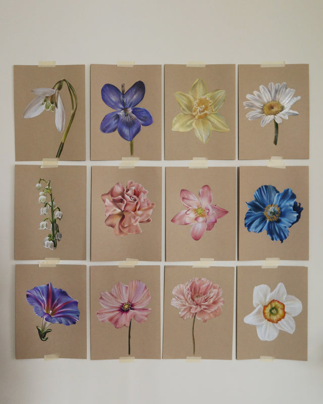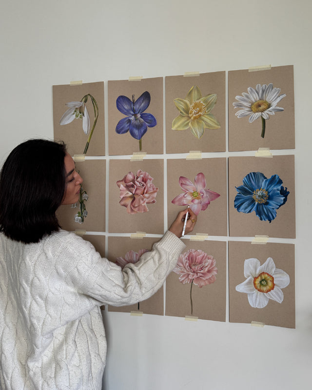 Environment is so important to me when I approach a new drawing - I usually try to have a clean space, incense burning, and a matcha to get in the zone. However life has been hectic recently, so I also take my sketchbook with me out and about and draw when I have a spare moment, whether I’m on set for a shoot, in a new city, or trying out a new cafe. Each individual flower has its own intricacies which were a lot of fun to discover and render - I loved exploring the different variations in colour and shape. It really makes me appreciate how clever mother nature is.
