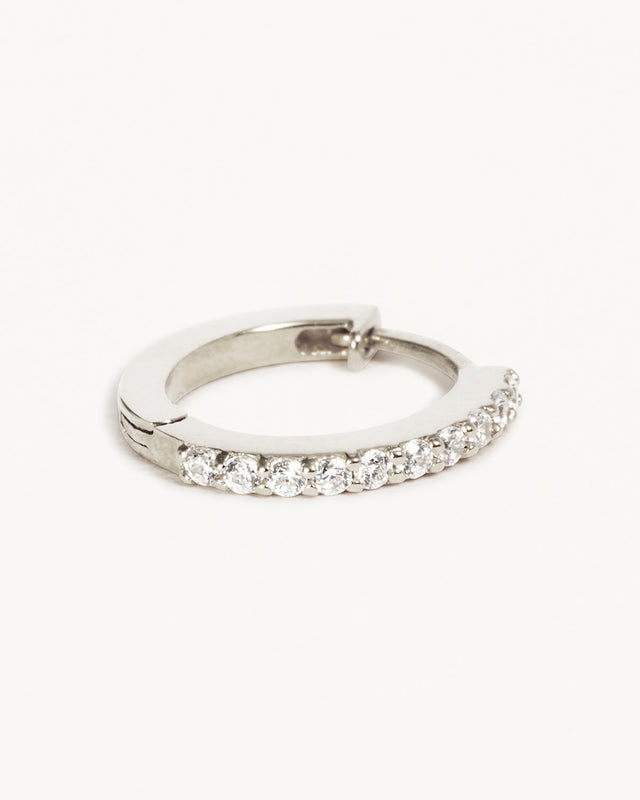 Encrusted with crystals, our 14k Gold Celestial Sleeper is an ode to the heavenly planes and the magical night sky. This delicate sparkling hoop was made to be adorned and layered; a versatile must-have.