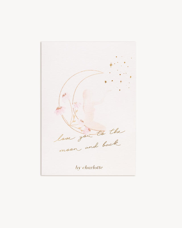 Our Love You To The Moon Greeting Card was designed in-house exclusively for by charlotte. This card has been created with love and intention for you to give to someone whose love makes you feel like you’re dreaming among the stars.